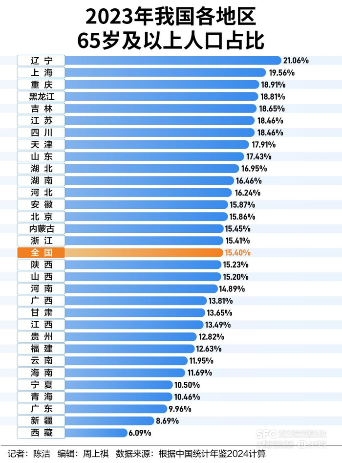 最新发布的中国统计年鉴2024,展现出我国各个地区老龄化的现状。目前,我国各地的老龄化现状明显不同:2023年,65岁及以上人口占比中,辽宁达到21.06%,是各个省份中占比最高的;与之相对应的是,广东、新疆和西藏65岁及以上人口占比尚不足10%。