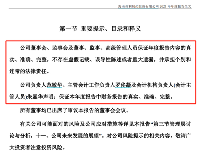 《理财周刊-财事汇》翻阅普利制药2021年年报发现,彼时年报称:“公司董事会、监事会及董事、监事、高级管理人员保证年度报告内容的真实、准确、完整,不存在虚假记载、误导性陈述或者重大遗漏,并承担个别和连带的法律责任。”