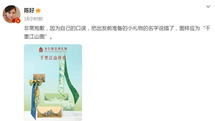 11月27日晚,演员陈好在个人社交账号发文道歉:“因为自己的口误,把出发前准备的小礼物的名字说错,图样应为《千里江山图》。”