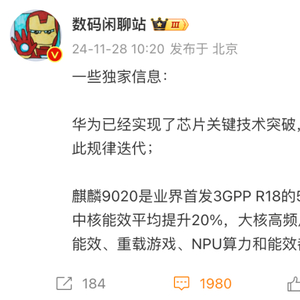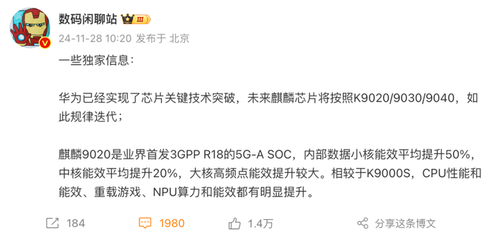 如上图所见,爆料博主数码闲聊站分享了一些独家信息,称:“华为已经实现了芯片关键技术突破,未来麒麟芯片将按照K9020/9030/9040,如此规律迭代;麒麟9020是业界首发3GPP R18的5G-A SOC,内部数据小核能效平均提升50%,中核能效平均提升20%,大核高频点能效提升较大。相较于K9000S,CPU性能和能效、重载游戏、NPU算力和能效都有明显提升。 ”