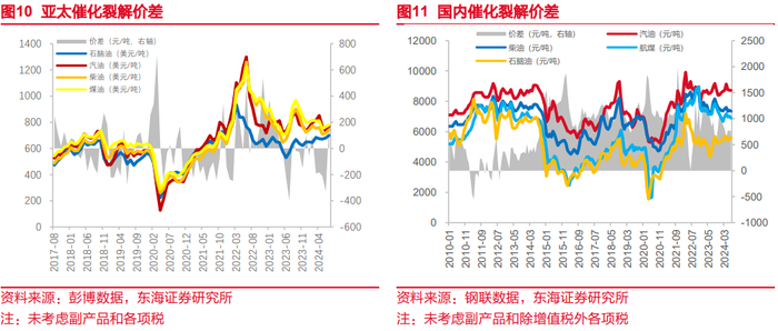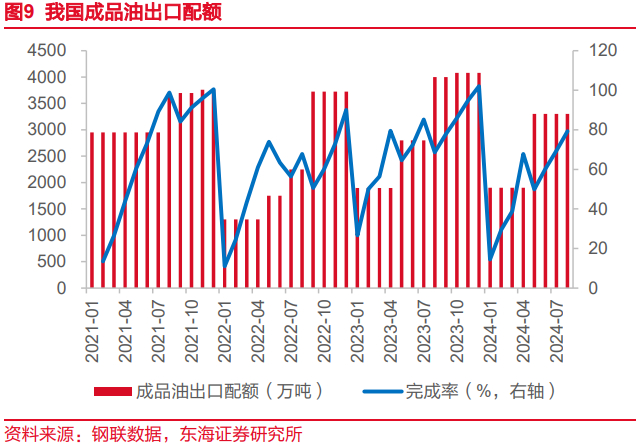 截至9月,我国成品油配额完成度为70.2%,相比于去年同期要减少7.6个百分点。其主要原因为海外需求放缓,亚太区域裂解价差走低。亚太区域裂解价差在2022年二季度至2023上半年一度走高,但随着全球经济增长放缓、原油价格维持高位,裂解价差再度下行。截至2024年10月,亚太催化裂解价差反弹至66元/吨,未来随着能源消费高峰到来,叠加未来原油价格下跌预期兑现,价差有望实现回归。