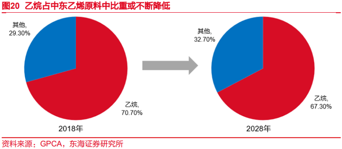 受乙烷供应减少影响,中东乙烯生产趋向重质化。GPCA的报告显示,过去GCC国家乙烷供应充裕且成本较低,一直是蒸汽裂解装置的主要原料,但受乙烷供应减少影响,GCC国家以乙烷作为乙烯原料的比重将不断降低,预测将从2018年的70.7%下降至2028年的67.3%;同时GPCA指出GCC国家乙烯生产成本优势在逐步缩减,2013年该地区的乙烯生产成本相较全球平均成本低60%,2018年仅低30%。从趋势上来看GCC国家逐步采取乙烯原料重质化方案,其中SABIC和沙特阿美正在开发原油直接制化学品(COTC)技术,通过混合进料增强生产经济性。
