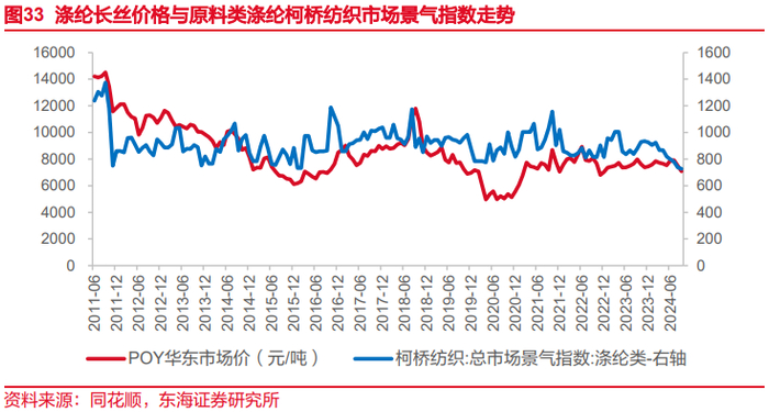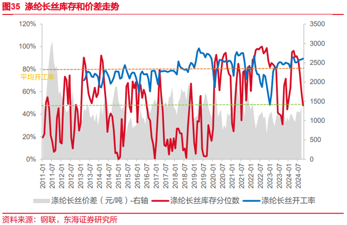 库存周期:近十年比较明显的主动补库阶段例如2013年下半年-2014年初,2017-2018年,2021年,皆与需求周期共振。目前长丝开工率维持高位,超过历史均值80%;库存天数位于历史分位48%,长丝价差有望维持,景气尚可。若后续需求好转、成本企稳,价格有望具有更多弹性基础。