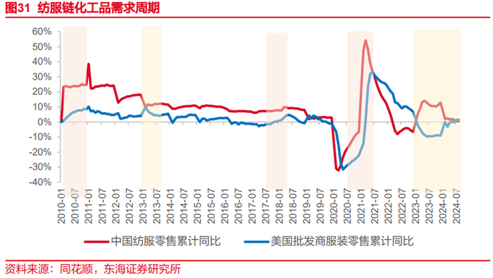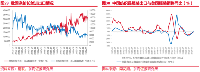 需求周期:涤纶长丝的下游包括纺服和工业,行业需求主要取决于纺服领域。从需求端看,我国纺服链化工品受益产业链完善及一体化成本优势,逐渐占据出口高地,成为全球消费和出口大国。2023年实现服装、鞋帽、针纺织品零售额1.4万亿元,纺织品服装出口总额为2936.4亿美元,出口占总产值比例约59%。
