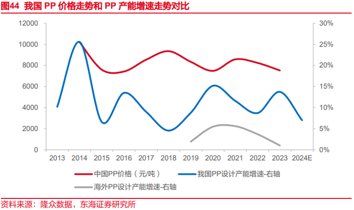 综上所述,虽然聚烯烃价格影响因素很多,包括原油、宏观及需求,但一般产能周期到来的话,其波动幅度对价格和利润都会产生更大的影响。据隆众数据,预计2024年PE产能增速21%,PP产能增速7%,整体聚烯烃产能仍处于释放周期,且消费需求增速低位维持,我们认为2024年在不考虑原油成本价格的影响下,聚烯烃自身亦有较大供需压力。