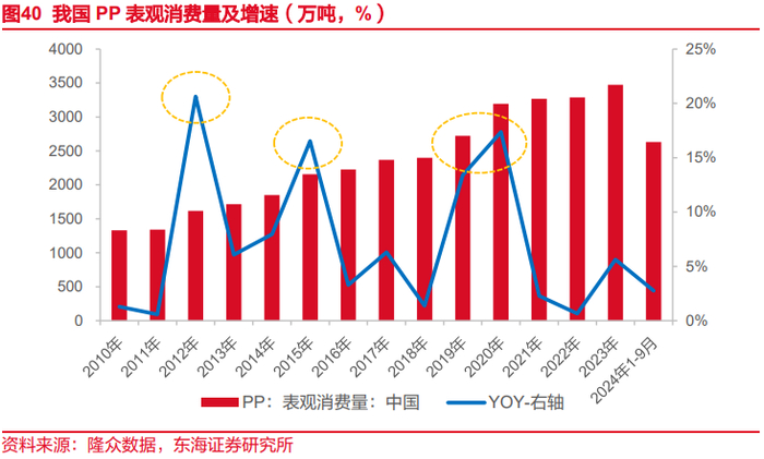 据隆众数据,2023年,我国PE年表观消费量达4068万吨,2010-2023年复合增长率7%。与上文下游行业表现一致的是,消费量增速高峰出现在2010年,2013年和2017-2020年。2024年1-9月份,我国PE表观消费量达3029万吨,同比增速降至1%,符合下游行业经营情况。观察PP年表观消费量,亦有类似表现。2010-2023年复合增长率8%。2024年1-9月份,我国PP表观消费量达2630万吨,同比增速降至3%。