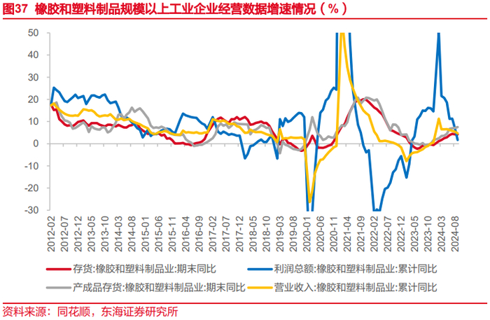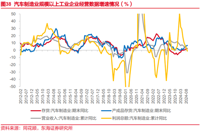 从橡塑和塑料制品企业的数据看,其利润改善往往早于聚烯烃原料,库存周期也早于聚烯烃原料,符合从下游需求带动传导到上游,从而拉动上游聚烯烃原料价格的上涨。目前来看其企业库存和产成品库存均有累库趋势,且利润数据下降明显,还未来到明显周期拐点,景气度较差。汽车制造业数据目前亦是同样情况。2023年下半年的去库到2024年上半年的主动补库,盈利情况在一季度快速好转后,三季度呈现一定下行压力。