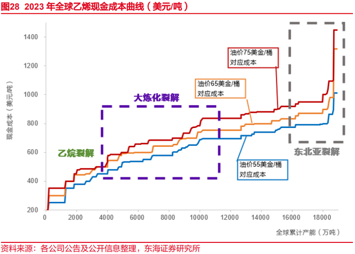 我国新增乙烯产能有望占据全球成本优势。2020年以来,国内乙烯产能进入第二个高速增长期。相较于国际上的老旧产能,我国主要新增/升级改造乙烯产能具备多方面优势,包括:更低的操作成本(技术进步、工业4.0)、更低的原料成本(大炼化裂解、重油裂解等)、更新的设备所需较短维护期,使得国内新建乙烯产能平均现金成本逐步向成本曲线左端偏移。根据测算,到2027年,在布伦特油价65美元/桶的情形下,我国平均新增/改造乙烯产能现金成本约为688美元/吨,已处于成本曲线左部位置,其中部分乙烷裂解产能成本甚至达到全球最低区间,MTO乙烯产能的成本优势则主要取决于装置所处区域的煤炭价格及装置的规模优势。