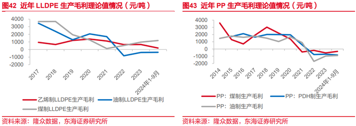 从LLDPE的价格表现去看,价格走势基本上跟随产能周期,会略延迟于产能增速表现。2014-2015年国内煤化工处于产能释放周期,同时页岩油革命后,美国原油独立,能源弱势,2015年LLDPE价格明显下滑。随后虽然国内产能增速偏低,但由于海外产能增速逐步抬升,通过PE进口逐步传导,使得LLDPE价格持续承压。2021年,虽然PE产能增速在明显抬升,但由于地缘政治导致能源价格上涨,支撑LLDPE价格震荡上行。2022年在产能释放和成本压力下,油制LLDPE利润大幅下滑。2023年需求较2022年修复,且产能增速回落至低位,油制LLDPE利润有所修复,但仍处于亏损。