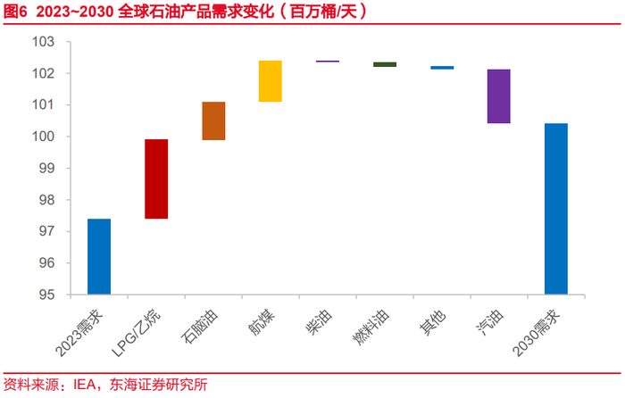 需求方面,随着新能源车的逐步普及,预计道路运输燃料需求增量将会受到挤压,而石化原料NGL和石脑油的大量使用将会支撑未来十年石油消费的增长。叠加生物燃料消费增长,精炼产品的需求和新增炼油产能的需求将受到削弱,预计到2030年,非精炼燃料的增量将占据超过75%的新增需求。此外,航空活动的进一步增长,航煤有望成为成品油中需求唯一增长的品种。