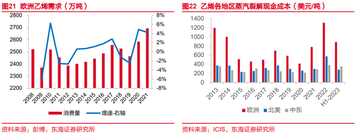 欧洲乙烯需求受到多重压力。欧洲乙烯需求自2017年开始下跌,2019年起逐步恢复。根据彭博数据,截至2021年欧洲乙烯需求为2691.75万吨。根据Chemanalyst统计,2022年欧洲乙烯市场为2350万吨,其中54%的乙烯用于下游聚乙烯生产,而近期包装和塑料行业需求基本面低迷,环氧乙烷市场基本面也依然疲软。成本端:乙烯生产成本高企。目前欧洲乙烯生产主要以石脑油为原料,据ICIS数据,2022年欧洲乙烯成本较2021年上升70%,2022年现金成本达1300美元/桶以上,且始终较北美和中东而言成本高企,2023H1欧洲乙烯蒸汽裂解现金成本为880美元/吨以上,同期北美和中东均为300美元/吨左右。监管端:脱碳压力下欧洲监管严格。随着汽油利润率下降和脱碳压力增加,欧洲炼油行业运营中期内面临极大压力,能源咨询公司伍德麦肯兹对全球465座炼油厂进行综合评估发现,有121座存在不同程度的关闭风险,相当于1995万桶/日的炼化产能面临淘汰,这约占2023年炼化总产能的21.3%,其中多达360万桶/日炼化产能被列为“高风险”,而这些产能大部分位于欧洲地区,欧洲有11座炼油厂被列为“关闭高风险”,在高风险关闭产能中占比达45%。