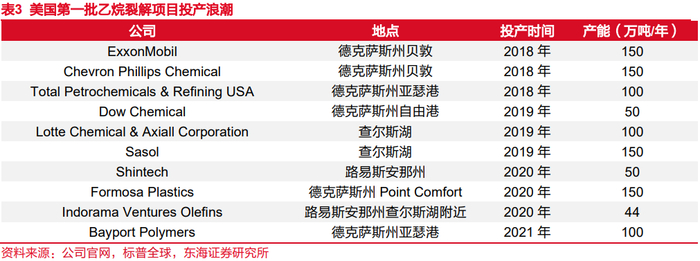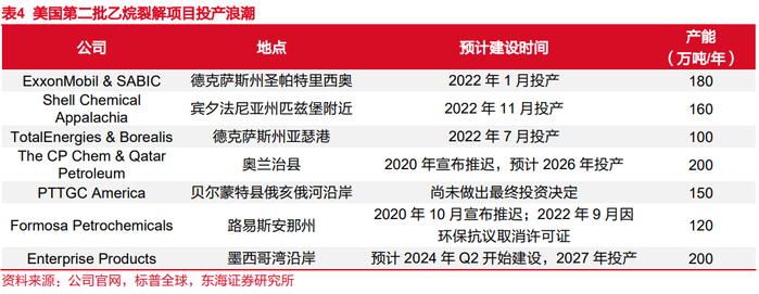 北美乙烯需求下跌,美国乙烯产能增长放缓。美国页岩气革命带动乙烷产量激增,同时乙烷相对较低的成本和较高的乙烯产量刺激乙烷作为乙烯原料的使用。美国于2016年开启第一波乙烷裂解项目投产浪潮,大致于2020年结束,其中Bayport Polymers因疫情影响2021年投产,美国第一波投产浪潮大致开展10个乙烷裂解项目,美国乙烯产能也从2016年的2939万吨提升至2020年的4033万吨,CAGR达8.23%。后续美国在2022-2024年开启第二波投产浪潮,但此次参与项目较少且多数项目因未满足环保要求、合作方退出等原因宣布推迟,同时北美乙烯消费量同比呈下降趋势,至今仅有440万吨/年产能顺利投产,预计本轮投产带来的乙烷裂解产能较之前大幅下降。同时根据已公开项目产能计算,2030年北美乙烯产能较2023年增长仅8.94%,北美乙烯总产能及美国乙烯产能未来增速均放缓。