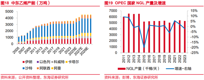近年来中东乙烯产能保持稳定。中东地区拥有丰富油田伴生资源以及政府对乙烷定价的控制,乙烷价格于全球具备较强优势。中东乙烯产能主要由沙特提供,2022年沙特乙烯产能达1893.8万吨,占中东乙烯总产能的53.20%。2007-2016年中东开启乙烯产能扩产,合计总产能自2007年的1331.44万吨增长至2016年的3382.71万吨,CAGR达10.92%,后产能维持在3500万吨左右,增速显著放缓,主要是由于2015年后OPEC国家NGL产量出现较大幅度下跌,富含乙烷的油田伴生气资源随乙烯产能大幅增长而逐渐消耗。