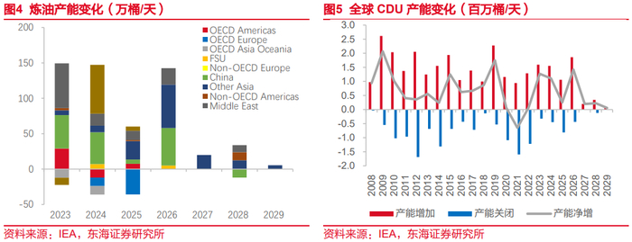 根据EIA数据,全球炼油产能预计在2023~2030年间将增长330万桶/天,与此前的其中亚太、非洲及中东地区将贡献主要的产能增量,而欧洲及其他OECD国家则贡献了主要退出产能。全球炼油行业预计将进入一个增长缓慢的时期,到2030年名义产能(包括凝析油分离)预计将增长至107.4百万桶/日。可以看到2026年后,全球炼油产能增长将出现断崖式的下行,一转此前的历史趋势。