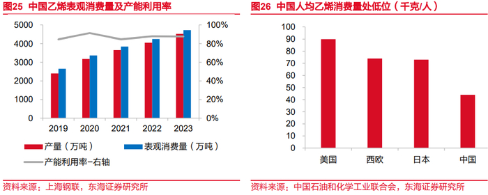 我国乙烯产能利用率处较高位,人均乙烯消费量处低位。根据上海钢联数据,2023年我国乙烯表观消费量为4715.75万吨,同比+11.08%。产能利用率近年来始终保持在80%以上,2023年为87.51%,较全球而言处较高位。尽管我国乙烯消费量保持稳定增长,但从人均乙烯消费量来看,我国2022年人均乙烯消费量为44千克/人,同期美国/西欧/日本分别为90/74/73千克/人,我国人均乙烯消费量相对美国等国家而言仍处于低位,未来存在进在一步提升空间。