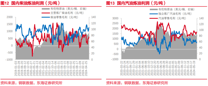 可以注意到,成品油炼厂毛利波动领先于零售利润约三个月,其主要原因是炼厂一般储备三个月的原料库存,而成品油调价反应相对迅速,故形成了时间差;而炼厂成品油毛利和国际油价基本成反比,且落后于国际油价约一个月,原因主要为“10工作日+22日移动平均”的调价机制。整体上来看,炼厂炼油利润基本与国际油价成反比,但油价从低位爬升的过程中,炼厂存在约两个月的利润爬升期;当油价从高位迅速下跌,炼厂同样因库存原因可能亏损;当国际油价缓慢下行,则有利于炼厂修复毛利区间。