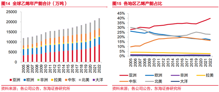 全球乙烯产能逐年增加。乙烯产能在近几次周期始终保持增长趋势,2022年全球乙烯产能合计为2.18亿吨/年,同比2021年提升5%。其中欧洲、非洲、拉美及大洋洲产能相较上一年已保持平稳,未出现新增产能,中东产能增速也相对放缓。当前全球乙烯产能主要为亚洲和北美贡献,其中亚洲乙烯产能不断提升,占全球总产能的比例已从2005年的28.01%增长至2022年的39.78%,2019-2022年亚洲乙烯产能CAGR达10.23%。
