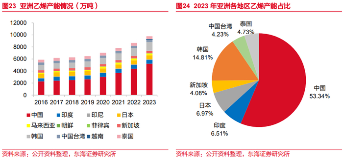 亚洲乙烯产能不断增加,我国为主要贡献力量。亚洲乙烯产能始终保持增长,据统计2023年亚洲乙烯产能约为9779.90万吨,自2016-2023年产能CAGR为7.54%。其中中国乙烯产能占比最大,2023年中国乙烯产能达5216.7万吨,占亚洲总产能比例达53.34%,其次为韩国(14.81%)、日本(6.97%)和印度(6.51%)。