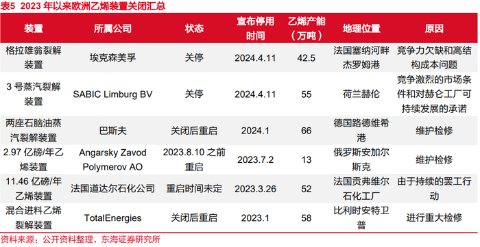 欧洲多家公司乙烯装置受压力关闭。由于业务增长乏力、能源成本高企以及过度监管三重负担,欧洲公司需永久性降低运营成本。自2023年以来暂停或关闭多家公司,自2024年以来,4月10日SABIC发布公告,将位于荷兰赫伦的烯烃3裂解装置永久关闭,年产能为55万吨乙烯和32.5万吨丙烯。同时埃克森美孚于4月11日表示,计划于2024年关闭位于法国格拉雄翁一座蒸汽裂解炉,以及相关衍生部门和物流设施。格拉雄翁工厂拥有乙烯产能42.5万吨/年、丙烯产能29万吨/年,相关衍生产品包括聚乙烯、聚丙烯。这两家公司的决策均基于财务亏损和欧洲工厂竞争力不足的现实情况。