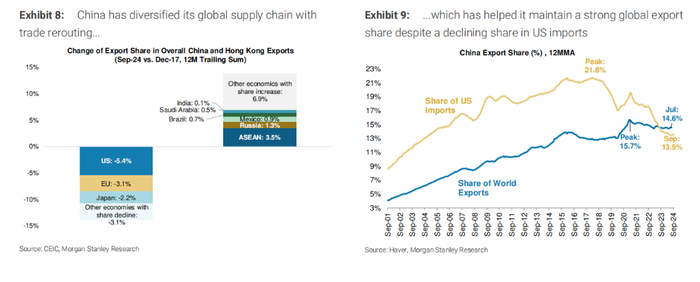 2025年,尽管美国关税政策存在不确定性,中国外贸依然展现出强大的适应力和韧性。摩根士丹利预计,2025年中国商品和服务出口的实际增速将达到6%,显示出中国在全球供应链中的核心地位依然稳固。