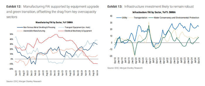投资领域方面,摩根士丹利指出,2025年中国政府将继续实施积极的财政政策,以应对外部环境的不确定性并提振经济。预计基础设施投资增速将从2024年的9%进一步上升。