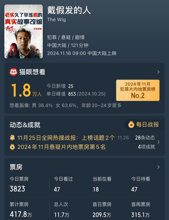 据猫眼专业版,影片正式上映后,首日排片占比7.2%,票房209万元,此后排片占比和票房持续下滑,上映第三天排片占比就降到4.7%,票房32万元。
