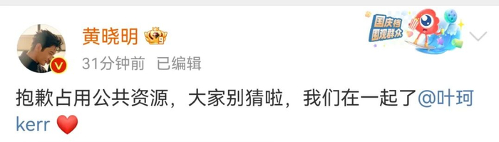 9月19日,黄晓明在个人社交账号发文称,“抱歉占用公共资源,大家别猜啦,我们在一起了”,并@叶珂。