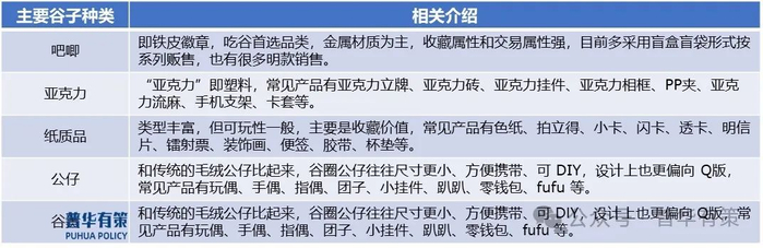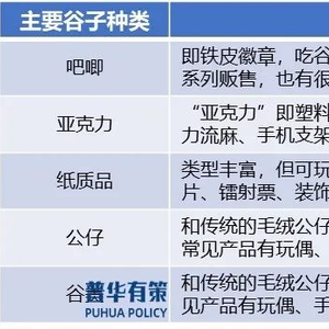 谷子有多种分类方式:根据IP来源,常见的可分为国谷、日谷;根据价格,通常分为普谷、湖景谷和海景谷(价格依次递增);根据品类和材质,可分为“吧唧”、公仔、亚克力、纸制品、谷美等,不一而足。谷子文化发源于日本,已经衍生出一系列谷圈常用术语,成为谷圈爱好者的交流“黑话”。