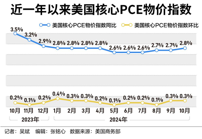 当地时间11月27日,美国商务部经济分析局(BEA)公布的数据显示,10月核心PCE物价指数同比上涨2.8%,为今年4月以来的最高水平,9月攀升2.7%。10月PCE物价指数上升了2.3%,也较9月的2.1%出现反弹。