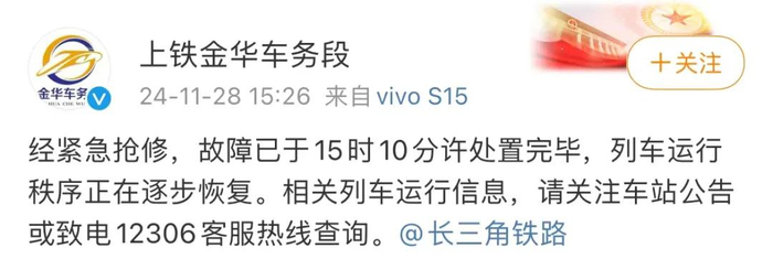 下午3点26分,@上铁金华车务段 再次发布消息:经紧急抢修,故障已于15时10分许处置完毕,列车运行秩序正在逐步恢复。相关列车运行信息,请关注车站公告或致电12306客服热线查询。