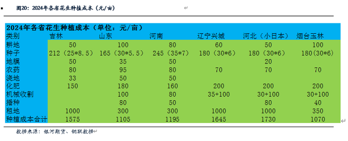 今年花生种植面积增加,但单产减少较多,整体预期今年花生产量和去年基本持平。根据我们去花生产地的调研,由于种植玉米收益较低,花生收益仍可观。2024年吉林地租下降,种植成本减少,2024年吉林的种植成本在1500元/亩左右。花生与大豆、玉米等农作物相比,收益可观。河南和山东产地,农户大部分是自有土地,种植成本基本在500-700元/亩,花生米亩产在400斤左右,即使按照4.0元/斤计算,花生收益也高于玉米。目前市场反应,今年玉米价格继续下跌,河南等地种植花生意愿仍较高。