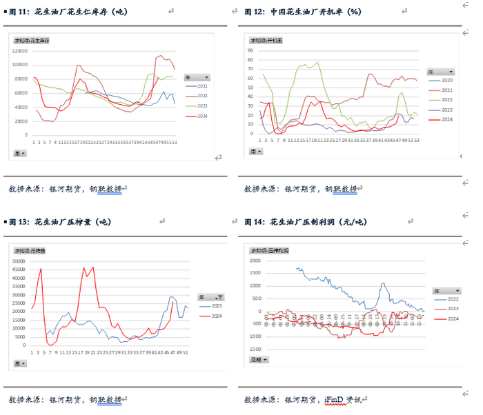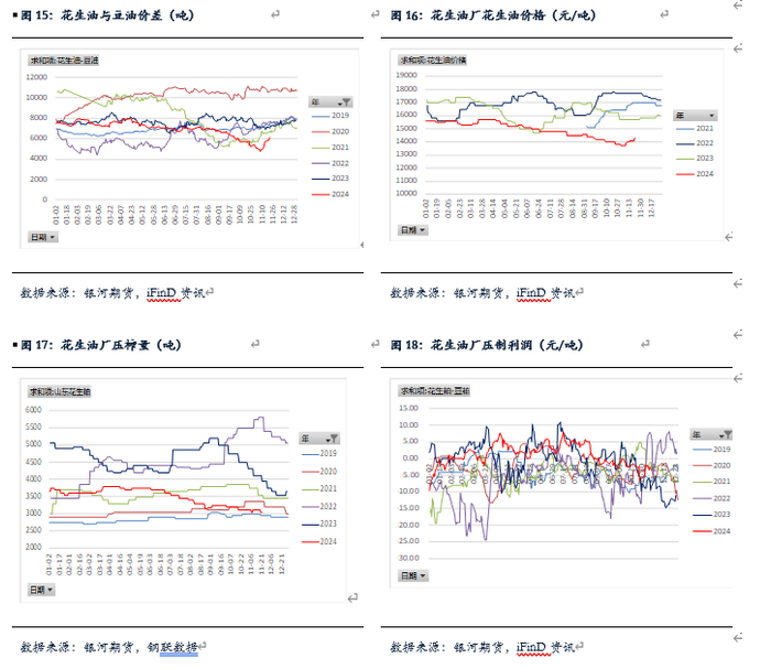 2024年种植面积虽然增加,但单产减少,市场预期今年花生产量和去年持平。新季花生陆续上市,下游需求仍偏弱,油厂陆续进场收购,但通货花生价格回落。