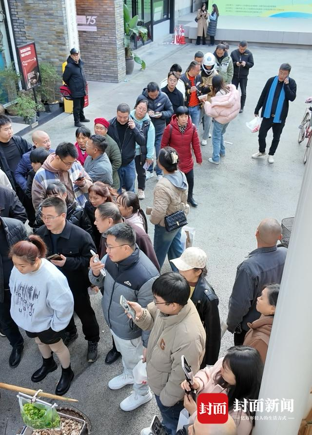 11月28日,在温江区的文庙印巷内,记者看到,“王鸡肉”在单独的一个区域里售卖凉拌鸡肉,周围围了一圈看热闹的人,他们手中拿着手机,不是在直播就是在拍视频,排队买鸡肉的队伍有好几米长。