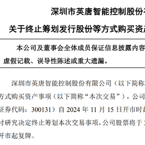 11月28日晚,英唐智控发布公告,此前,公司拟通过以发行股份及支付现金的方式取得爱协生的控制权,公司股票自11月15日起停牌。由于交易相关方未能最终就交易方案以及未来产品战略发展达成共识,各方决定终止筹划此次交易事项,公司股票将于11月29日复牌。