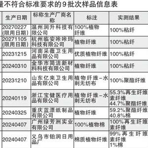 江苏省消费者权益保护委员会近日通报了柔巾产品比较试验结果,在50批次样品中,9批次纤维含量不符合标准,7批次涉嫌夸大、虚假宣传。