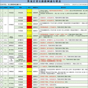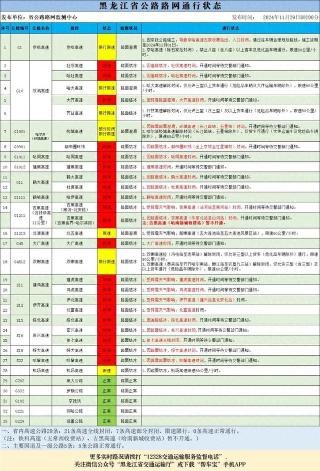 11月29日8时汇总路况信息:全线封闭的高速有(21条高速):哈牡高速、建黑高速、绥大高速、建虎高速、大广高速、密兴高速、大齐高速、鸡虎高速、伊北高速、绥北高速、哈同高速、依七高速、鹤哈高速、哈肇高速、北富高速、鹤大高速、牡复高速、牡绥高速、都市圈环线、吉黑高速(黑河-北安段)、吉黑高速(吉黑省界-哈尔滨段),封闭。部分封闭限速限行的高速有(7条高速):1.哈尔滨绕城高速(长江路站、五星站),封闭。2.双嫩高速(冯屯站至老莱站)、齐甘高速,仅允许三型(含三型)及以上货车通行(危化品运输车辆除外),限速80公里/小时。3.京哈高速(除石家站),禁止八座(含八座)以上客车及危化品车辆通行,限速80公里/小时。4.哈尔滨绕城高速(长江路站、五星站除外),仅货车可通行(大件运输车及危险品车辆除外),限速80公里/小时。5.双嫩高速(泰来站至齐齐哈尔南站、嫩江站至九三农垦站)、哈大高速,仅允许三型(含三型)及以上货车通行(危化品运输车辆除外),限速60公里/小时。6.北漠高速、机场高速,限速60公里/小时。