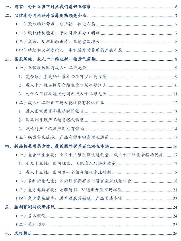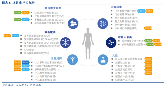 最后,中长期维度公司也有望完成向肠外营养用药全方案供应商的转变。肠外营养作为一套完整治疗方案,是复合维生素、多种微量元素、复方氨基酸等一系列产品的组合,产品之间具有较强的协同效应。经过多年研发投入,卫信康已打造出包含复合维生素、多种微量元素、复方电解质、复方氨基酸在内的肠外营养用药产品梯队,能够为国内成人、儿童患者提供较为全面的肠外营养支持方案。依托在复合维生素领域极高的市场地位和强有力的销售渠道,我们认为公司在微量元素、复方电解质、复方氨基酸等领域也有望培育出诸如成人十二维一样的大品种,实现收入多元化并推动业绩持续增长。