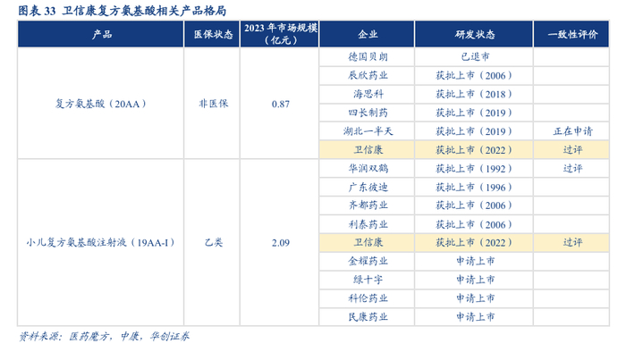 小儿复方氨基酸注射液(19AA-I):该产品适用于婴幼儿(包括低体重儿)及小儿的肠外营养支持,防止氮流失和体重下降,并可纠正负氮平衡。公司产品于2022年5月获批,目前国内已批准5款小儿复方氨基酸注射液(19AA-I),仅卫信康和华润双鹤具备一致性评价资质。根据中康数据,2023年小儿复方氨基酸注射液(19AA-I)2.09亿元销售额。