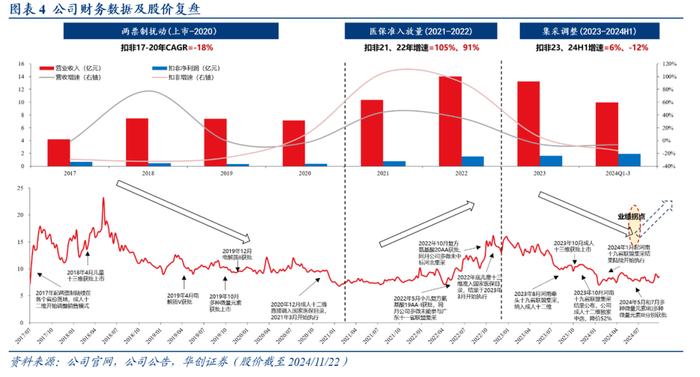 第一阶段,2017年两票制在各省份陆续推行,核心产品成人十二维由于销售模式的调整,产品销售出现波动,同时儿童十三维、多种微量元素等潜力新品尚未开始放量,因而公司业绩和股价也经历多年镇痛,2017-2020年扣非净利润CAGR为-18%;