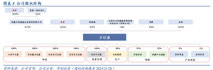 公司具有较为稳定的股权结构,截至2024年三季报,董事长、总经理张勇其与一致行动人直接或间接持有公司69.3%股权,为公司实际控制人,天津京卫信康为员工持股平台,持有7.8%股份。