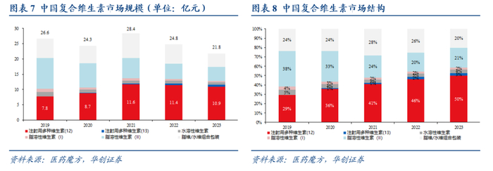 根据医药魔方数据,2023年中国静脉用复合维生素市场规模约21.8亿元,其中最大的品种为成人十二维,2023年销售额为10.9亿元,且在复合维生素整体市场中的份额逐步提升,2023年销售额已达到整体市场的50%,成人十三维和儿童十三维市场刚刚起步,销售额还比较小。