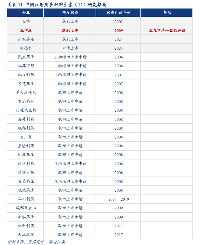 除原研百特和首仿卫信康两家产品上市外,后续山东鲁盛于2024年10月获批,海思科申报上市,其余20余家企业的上市申请均被驳回或主动撤回上市申请,国内成人十二维的竞争格局极佳。我们认为,卫信康能够成为国内成人十二维龙头的原因主要基于:
