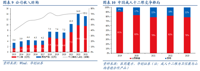 2023年公司收入13.23亿元,其中服务性收入约9.59亿元(基本都来自成人十二维,根据中康数据,卫信康与普德合作的蔗糖铁销售收入已不足1000万),占比约72%,为公司收入最主要构成部分。市场格局方面,根据中康数据,目前国内共有两家在售成人十二维产品,分别为美国百特和卫信康,百特的成人十二维(商品名:施尼维他)于2002年在中国上市,卫信康的成人十二维(商品名:卫美佳)2009年获批。根据医药魔方数据,卫美佳近年来一直保持约80%左右的市场份额,为国内成人十二维龙头。