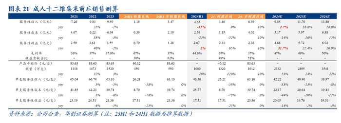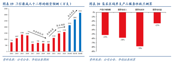 根据2024中报的数据情况进行拆分,我们预计在联盟区域单支成人十二维的服务性收入相较于集采前下滑58%,服务性成本减少78%,对应服务性收益仅减少25%,产品的毛利率得到大幅提升。因此,考虑到更快的销量增长态势、更小的收益下滑幅度以及明显的毛利率提升,我们预计成人十二维在集采后能够取得更好的收益表现。