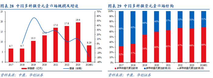 根据中康数据,2023年中国多种微量元素市场规模约19.6亿元(+10%),2017-2023年CAGR为20%。产品结构方面,多微市场13.1亿元(+9%),多微II约6.6亿元销售额(+12%),多微I尚未形成销售,费卡的多微III自2024年准入医保后(10ml规格价格为34.5元/支)正逐步进行临床推广。