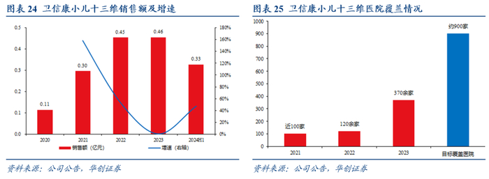 2022年底卫优佳顺利完成国家医保准入谈判,医保定价98.8元(4ml A瓶+1ml B瓶),价格降幅49.59%,医保结果从2023年3月开始执行。理论上,借助国谈身份,卫优佳有望在2023年实现较好医院准入并放量,但2023年8月医药反腐的启动导致医院准入工作暂停,卫优佳的入院以及采购工作受到较大影响,2023年医保首年的放量情况明显不及预期,全年收入4551万元,同比增长0.33%。2024年卫优佳的医院开发工作逐步恢复,2024H1收入3275万元,同比增长47%,且考虑到2023-2024年实际销售情况,预计今年年内续约时触发降价的可能性较小,小儿十三维有望在下一轮医保周期内取得较为亮眼的销售表现。