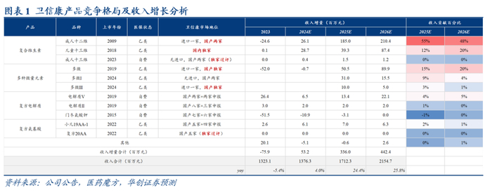 复合维生素类:主要产品为成人十二维(确认到市场服务)、儿童十三维和成人十三维。集采落地后服务性收益有望恢复较好增长,同时考虑儿童十三维和成人十三维的快速放量。预计2024-2026年复合维生素类收入增速分别为5.5%、21.3%和23.3%。