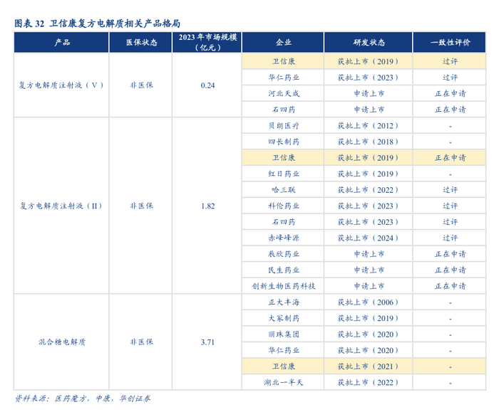 电解质V原研德国贝朗产品未在中国上市,卫信康的产品为国内首仿上市,后续华仁药业2023年获批,河北天成和石四药正在申请上市,竞争格局良好。当前国内电解质V市场规模较小,且处于自费状态,卫信康的电解质V已通过2024年国家医保药品目录形式审查,届时将参加年底医保价格谈判。