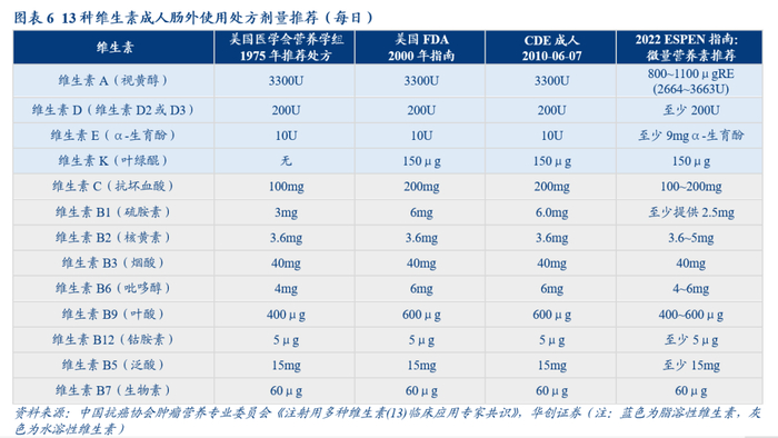 临床上用于肠外营养支持的复合维生素制剂包括水溶性维生素、脂溶性维生素(I)、脂溶性维生素(II)、注射用脂溶性维生素/注射用水溶性维生素组合包装(如注射用复方三维B)、注射用多种维生素(12)(即成人十二维)、注射用多种维生素(13)(包括成人十三维和儿童十三维)等。十二维同时包含脂溶性维生素A、D、E和9种水溶性维生素,十三维在十二维的基础上增加了维生素K。