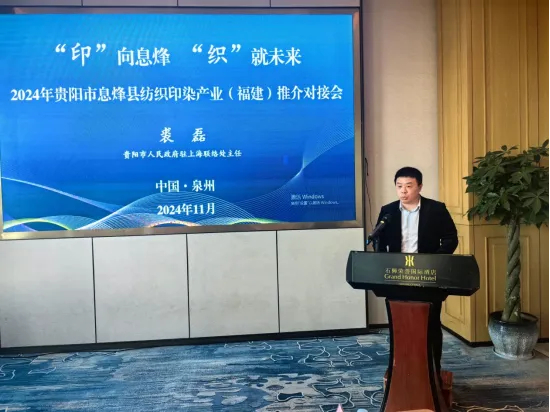 上证报中国证券网讯 11月27日,主题为“‘印’向息烽 ‘织’就未来”的2024年贵阳市息烽县纺织印染产业(福建)推介对接会举行,贵阳市人民政府驻上海联络处主任裘磊主持会议。